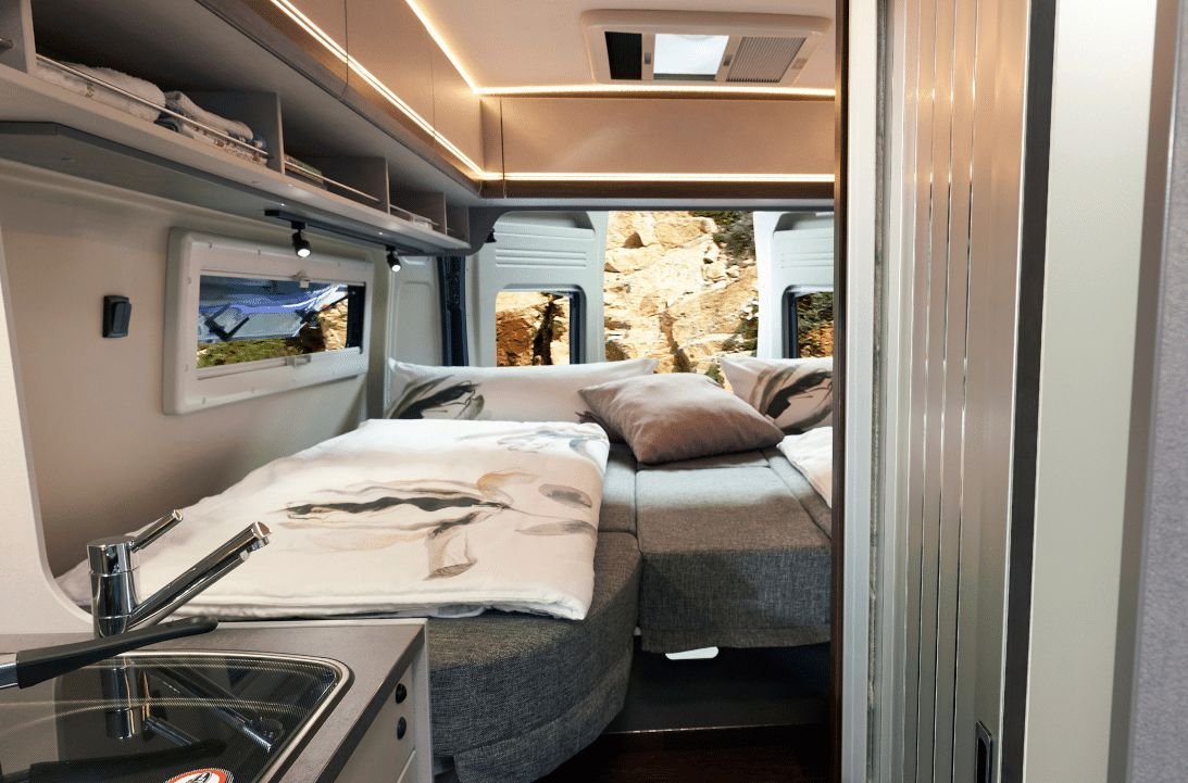 Der AktivCamper 2026 ist ein Pössl Summit Shine 600 L. Er bietet dir als komfortable Schlafmöglichkeiten zwei großzügige Einzelbetten im Heckbereich. Diese lassen sich zu einer einzigen großen Schlaffläche verbinden. Jedes Bett ist separat zugänglich, sodass du ungestört zurückziehen kannst, ohne über den anderen klettern zu müssen.