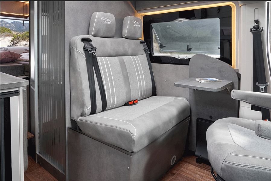 Die Vordersitze, sowohl der Fahrer- als auch der Beifahrersitz, lassen sich mit nur wenigen Handgriffen drehen. Zusammen mit dem Sitz hinter dem Fahrersitz entsteht so eine komfortable Sitzgruppe für drei Personen, die zum Verweilen oder gemeinsamen Essen einlädt. Ein besonders cleveres Detail ist der einklappbare Tisch, der sich dank einer Schienenführung an der Seitenwand stabil in Position bringen lässt aber nur, wenn er gebraucht wird. Im eingeklappten Zustand nimmt er kaum Raum ein, was besonders praktisch ist, um den Wohnbereich flexibel zu gestalten und mehr Bewegungsfreiheit zu schaffen.
